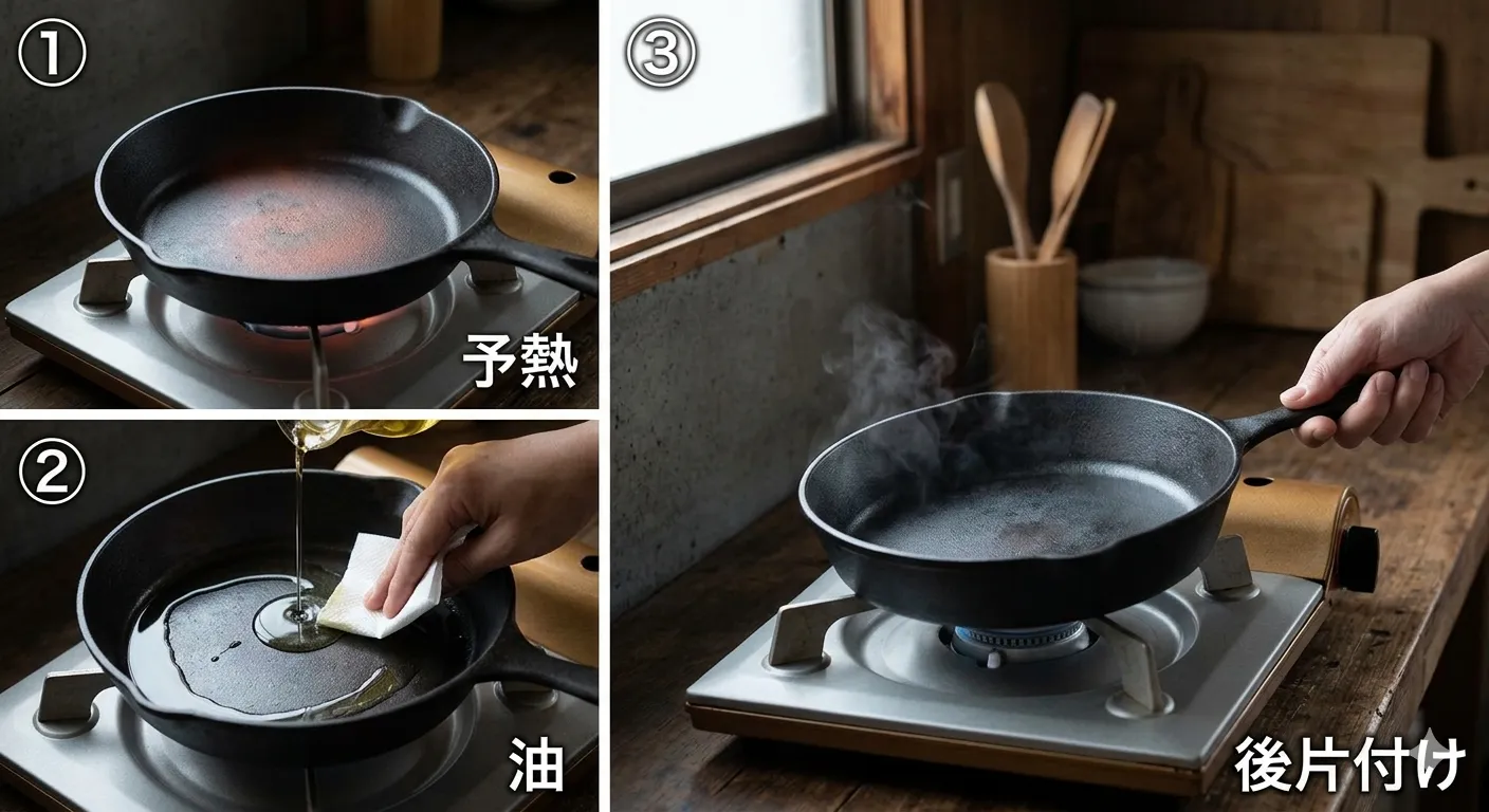 鉄フライパンはコツを押さえると、失敗が目に見えて減ります。ここでは「最小の手間で最大の効果」が出やすい基本形だけに絞ります。完璧を目指さず、再現しやすい順番でルーティン化するのがポイントです。