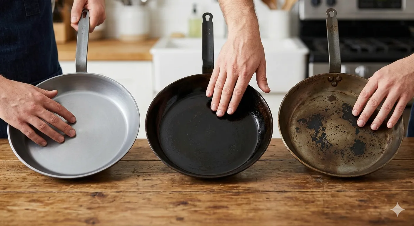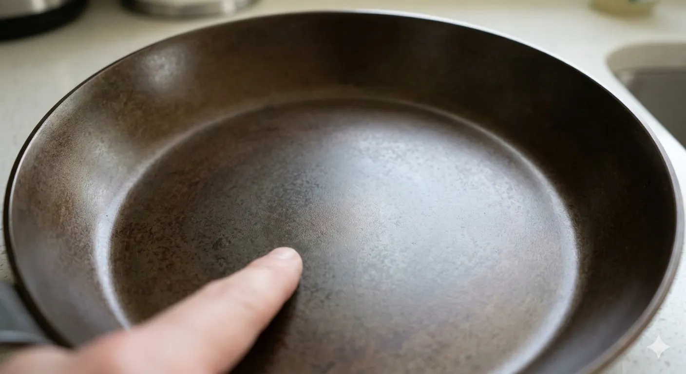 鉄フライパンは、油が熱で変化して表面に残りやすく、同時に鉄自体も酸化します。見た目は料理や火力で変わりやすいので、次の3点をセットで見ます。